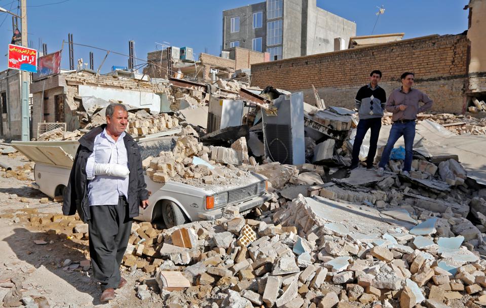 An Iranian man wearing a sling walks by as two others stand amidst the rubble in a street next to a damaged car in the town of Sarpol-e Zahab in the western Kermanshah province near the border with Iraq, on November 14, 2017, following a 7.3-magnitude earthquake that left hundreds killed and thousands homeless two days before. / ATTA KENARE/AFP/Getty Images